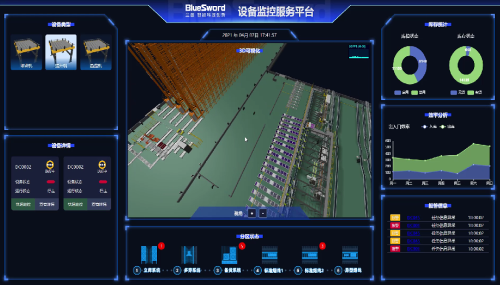 其中,以數(shù)字孿生為核心的物流軟件系統(tǒng)是整個智能倉儲物流自動化系統(tǒng)的大腦,其綜合運用精益管理、大數(shù)據(jù)、人工智能等技術,通過嵌入式軟件、業(yè)務應用軟件、商業(yè)智能軟件,對倉儲、分揀、配送、管理、考核等進行全面管控。并能夠?qū)崿F(xiàn)動態(tài)建模、虛擬仿真、離線調(diào)試、3D-SCADA在線監(jiān)控、主動性運維、預防性維護、決策分析等高階應用。