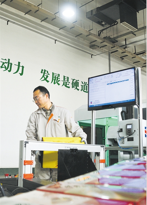 在揚州市局(公司)物流配送中心,布袋自動化包裝分揀線正在有條不紊地試運行。