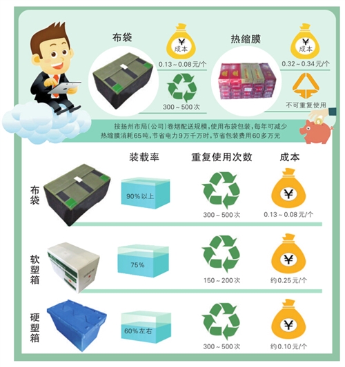 布袋包裝與熱縮膜包裝相比,一個熱縮膜包裝成本在0.32~0.34元,布袋重復使用次數(shù)能達到300~500次,成本在0.13~0.08元,每小時可節(jié)省24千瓦電力消耗。按照揚州煙草的配送規(guī)模計算,每年可減少65噸塑膜消耗,節(jié)省9萬千瓦時電力消耗,節(jié)省包裝費用60多萬元。