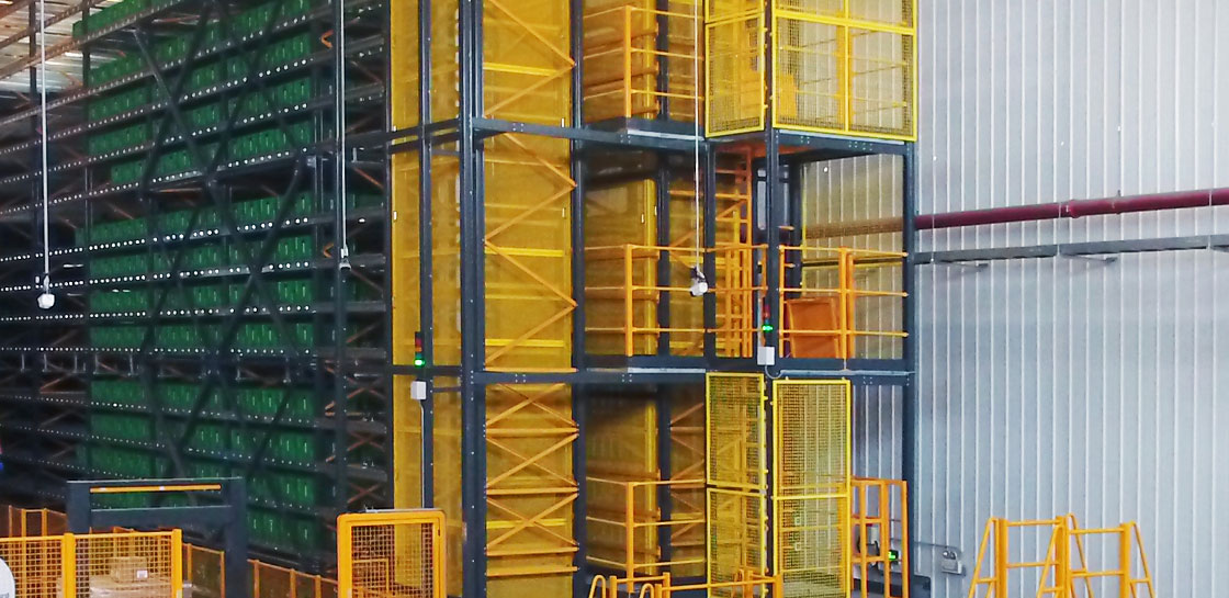 提升機用于在垂直方向上搬運料箱/穿梭車,使料箱/穿梭車快速到達不同層高的貨架位置。